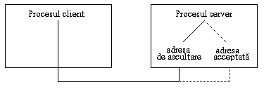 unde sd este descriptorul de socket, address indica o zona de date utilizator pe care nucleul o completeaza cu adresa de retur a procesului client care se conecteaza, iar addrlen precizeaza dimensiunea acestei zone. La revenirea din apelul accept, nucleul scrie īn addrlen un numar care semnifica dimensiunea spatiului ocupat īn zona de date. Apelul accept īntoarce un nou descriptor de socket, nsd, diferit de descriptorul sd. Un proces server poate continua sa asculte la socket-ul anuntat, īn timp ce comunica cu un proces client pe un canal separat de comunicatie (Figura 10.19).