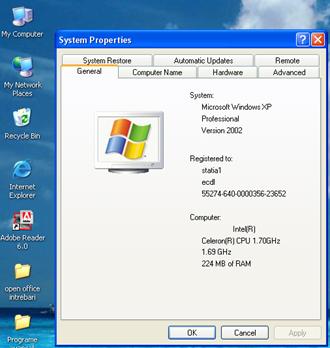 Memoria Ram poate fi de pina la 1 GB (16 Mb, 32 Mb, 64 Mb, 128Mb, 256Mb, 512 Mb, 1 Gb) Pentru a vedea cita memorie Ram avem pe calculator se realizeaza urmatorii pasi: Click dreapta pe My Computer, - Properties si se deschide urmatoarea fereastra: