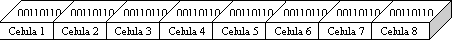 Memoria de lucru sau memoria RAM este construita din mai multe microcipuri si este oraganizata într-un sir de "camarute" numite celule asa cum se poate vedea în imaginea de mai sus. Dupa cum s-a vazut la punctul 5, un BYTE este format din 8 biti iar într-o celula de memorie este stocat exact un byte. Daca sunt 8 celule a câte 8 biti, vor fi în total 64 de biti. Cum o anume combinatie de biti 0,1 are o anume semnificatie, este necesar pentru claritatea informatiilor ca pozitia bitilor sa fie standardizata. Astfel, fiecare celula si fiecare bit din celula are o adresa proprie.