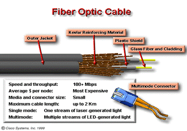 Cablul de fibra optica folosit la retele consta din doua fibre impachetate in doua teci separate .In sectiune ,se observa ca fiecare fibra e inconjurata de mai multe nivele reflectoare,invelis de plastic facut din Kevlar, si un alt invelis exterior. Invelisul exterior asigura protectia intregului cablu .Scopul invelisului de Kevlar este de a amortiza si proteja fibrele de sticla extrem de fragile .