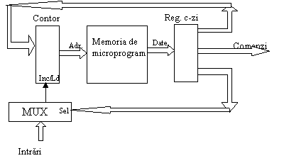 Ultima varianta se recomanda mai ales īn cazul implementarii unor circuite complexe, a caror functionare necesita modificari pe durata proiectarii. Īn principiu aceeasi schema bazata pe un microprogram poate implementa diferite functionalitati functie de continutul care se īncarca īn memorie. Īn figura de mai jos s-a indicat schema de principiu a unui circuit secvential care implementat prin microprogramare.