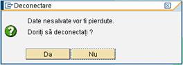 In ambele situatii sistemul informatic SAP va deschide fereastra de dialog "Deconectare", care atentioneaza ca orice date ce nu sunt inca salvate se vor pierde daca se efectueaza deconectarea.