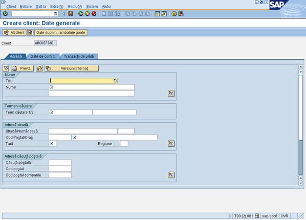 Obs.: * - pentru trecerea dintr-un camp in urmatorul camp - in ordinea stabilita de sistemul informatic SAP - se va actiona tastaTab; o alta modalitate de trecere in alt camp - in ordinea dorita de utilizator - este plasarea cursorului in campul nou si actionarea cu un click.