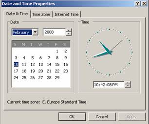 În coltul din dreapta jos este afisata ora setata pentru acel calculator. Pentru a modifica fie ora, fie data, se da click dublu stânga pe ora afisata, si se deschide o fereasta ca si în imaginea de mai jos, unde se observa o serie de optiuni precum "Date & Time" (data si ora), "Time Zone" (ora în functie de zona), "Internet Time" (ora reglata în functie de datele primite de pe Internet), etc., optiuni care pot fi modificate dupa cum dorim.