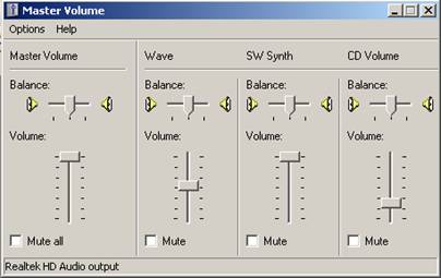 De aici decidem daca dorim o reglare simpla sau mai complexa a volumului. Daca dorim o reglare simpla, dam un singur click pe pictograma volumului, urmând a se deschide urmatoarea fereastra, de unde reglam volumul mutând în sus sau în jos cursorul. Tot de aici putem sa închidem volumul la zero, bifând casuta Mute (Silentios).