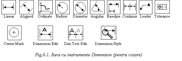 Pentru începerea cotarii desenelor în ACAD R 14 este suficient sa se selecteze (clic cu mouse-ul) pictogramele din meniu-ul DIM ( obtinut în urma selectarilor: VIEW, TOOLBARS, DIMENSION):