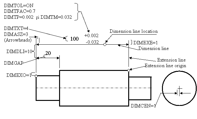 În versiunile mai vechi ale ACAD-ului valorile acestor variabile de cotare trebuiau precizate, dar pentru ACAD R 14 atribuirea acestor valori se face mult mai usor prin intermediul casetelor de dialog. Astfel, daca se doreste atribuirea unui anumit stil de scriere (de ex. Italicc de 3 mm înaltime) pentru diametre de arbori (simbolul %%c=j cu indicarea câmpului de toleranta (k6) si a valorilor abaterilor superioara si inferioara scrise simetric cu cifre având înaltimea 0,7 din cea a scrierii de baza (0,7*3=2,1 mm) trebuie completate casetele de dialog asa cum se vede din Fig.9.2. . . 9.6.