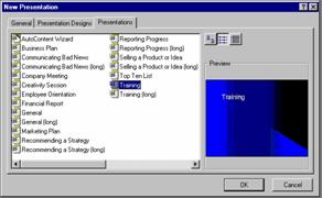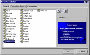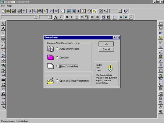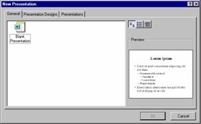 c) Blank Presentation - corespunde unei prezentari care va fi creata dupa propria noastra conceptie. Aceasta metoda se aplica selectand eticheta General, apoi Dublu Clic pe pictograma Blank Presentation. In continuare dialogul se va desfasura in caseta New Slide descrisa in continuare.