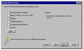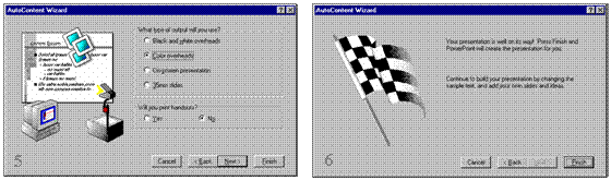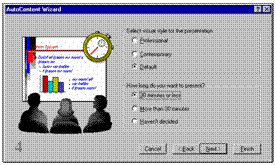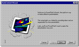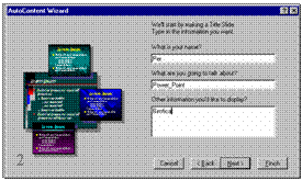 Wizard - vrajitorul realizeaza prezentarea punand o serie de intrebari prin diverse casete de dialog si asigura asistenta la crearea prezentarii, indicand la fiecare pas ce trebuie facut, apoi prezentarea se poate ajusta dupa preferinte. Sunt solicitate informatii referitoare la: