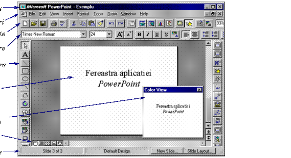 Fereastra de Prezentare (Presentation) se utilizeaza pentru crearea diapozitivelor si aranjarea lor intr-o prezentare, iar fereastra Diapozitiv in miniatura (Slide Miniature) permite vizualizarea la o scara redusa a unui diapozitiv.