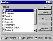 instrumente pot fi activate sau dezactivate prin meniul View, comanda Toolbards., utilizand fereastra alaturata, sau Clic