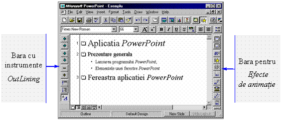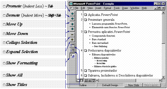 Butoanele View permit schimbarea modului de afisare. In figura anterioara este setat modul Slide View, iar in figura urmatoare se poate vedea modul Outline View.