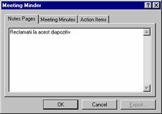 Meeting Minder. permite introducerea unor notite in timpul expunerii, pentru a le putea consulta ulterior (Speaker Notes);