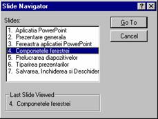Trecerea la un anumit diapozitiv (Goto, Slide Navigator.), care deschide caseta de dialog Slide Navigator (prezentata in figura de mai jos) prin care se poate alege diapozitivul pe care dorim sa il vizualizam;