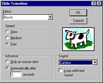 figura alaturata, care va deschide caseta de dialog Slide Transition reprezentata alaturat, fie vom selecta din castea derulanta Slide Transition