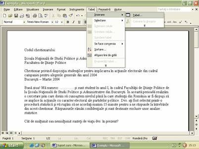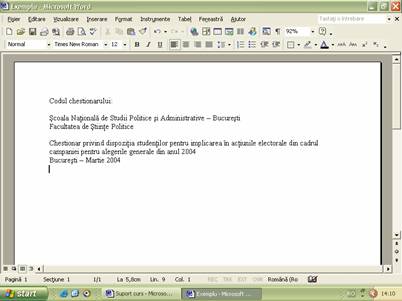 Lasam ca exercitiu pentru fiecare dintre voi finalizarea chestionarului pe care ni l-am propus. Respectând indicatiile metodologice care au fost formulate si cu ajutorul profesorilor de metodologie si metode si tehnici de cercetare, încercati sa realizati si sa editati un scurt chestionar privind tema propusa: disponibilitatea de implicare a studentilor în activitatile cu specific electoral ale partidelor politice în campania pentru alegerile generale din 2004. Deocamdata, nu acordati atentie prea mare caracteristicilor grafice ale elementelor pe care le utilizati în editarea chestionarului. În cursul urmator ne vom preocupa de sporirea performantei designului chestionarului prin modificarea corespunzatoare a acestor caracteristici.