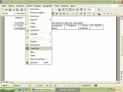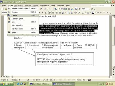 Daca doriti sa mutati o întrebare dintr-un loc în altul al chestionarului, atunci trebuie sa "decupati" întrebarea din locul ei initial si sa o "lipiti" în noua ei locatie de pe foaie. Ce înseamna asta? Decuparea - ca si copierea - oricarui obiect grafic dintr-un document Word presupune mai întâi de toate selectarea obiectului respectiv. Aceasta se face în cazul textului facând clic stânga înaintea primului caracter al selectiei pe care o dorim si deplasând cursorul mouse-ului fara sa ridicam degetul pâna dupa ultimul caracter care dorim sa faca parte din selectie. În cazul tabelelor, selectarea acestora se face cu clic stânga pe simbolul care apare în coltul din stânga sus al tabelului respectiv atunci când ne aflam cu cursorul mouse-ului deasupra tabelului. Selectarea casetelor text se face cu clic stânga pe una dintre cele 4 margini ale casetei. Selectarea altor obiecte grafice se face pur si simplu cu clic stânga pe obiectul respectiv.