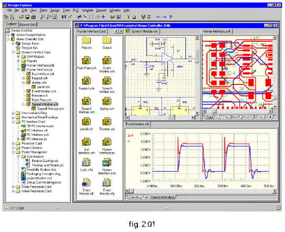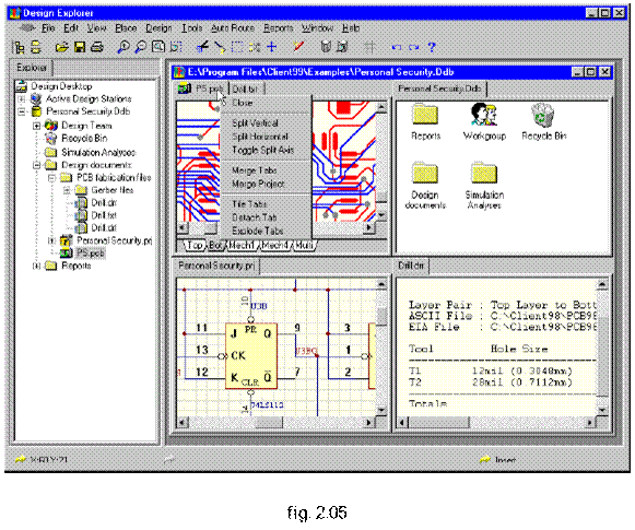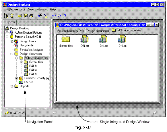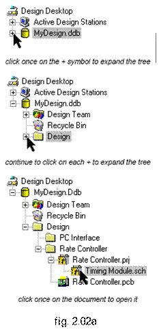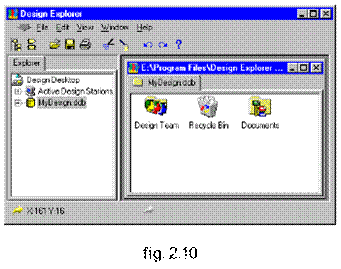 La fel ca si în File Explorer, exista 2 regiuni în care se lucreaza: arborele de navigare în panoul din stânga si imaginea unde sunteti in mod curent in arbore, în dreapta. În Design Explorer, aceasta o fereastra spre baza de date Design Database deschisa si este numita Design Window (fereastra de proiectare), conform figurii 2.02.