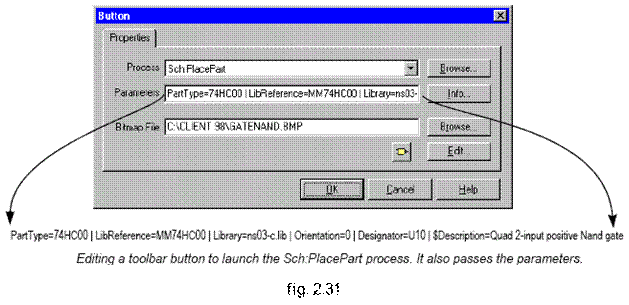 Se considera Sch: PlacePart process. Când lansezi acest proces (selectezi Place - Part), va aparea un dialog pentru Library Reference pentru partea care se doreste. Dupa ce ai introdus datele, va aparea o a doua fereastra de dialog care te intreaba ce Designator sa foloseasca, apoi apare partea mobila pe cursor. Inainte sa intri în Library Reference si în Designator dialog, poti trece informatia atunci când lansezi procesul.