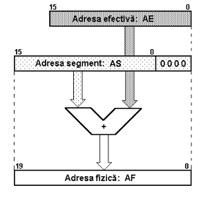 -adresa fizica a bazei unui segment se face inmultimn cu 16 baza AS iar apoin in interiorul segmentului pozitionarea se face adunand AE la el