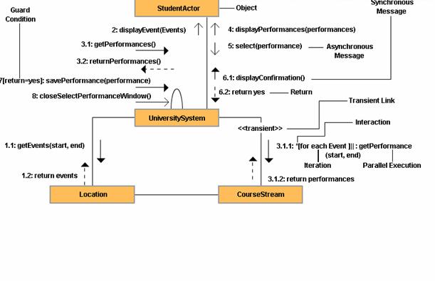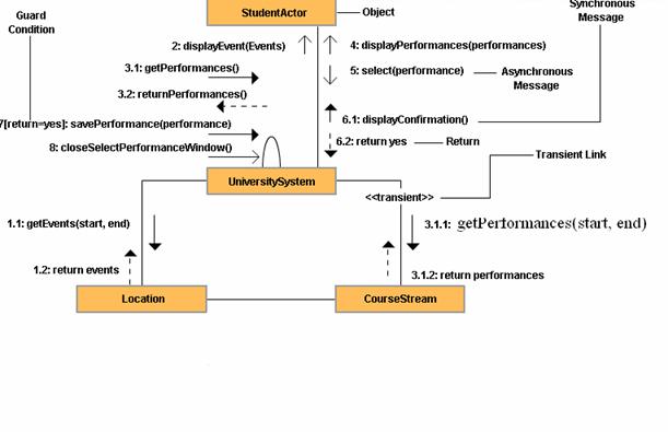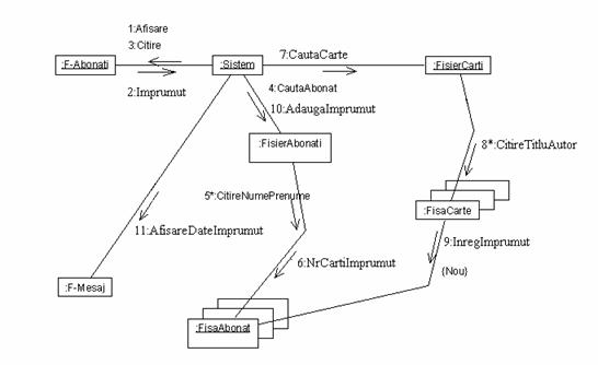 Figura urmatoare reda o posibila diagrama de colaborare, corespunzatoare unui scenariu al cazului de utilizare "Imprumut". Scenariul corespunde secventei tipice de evenimente a cazului de utilizare, adica: utilizatorul este inregistrat ca abonat, el nu a imprumutat numarul maxim admis de carti, cartea este gasita si imprumutul inregistrat. Obiectele redate in diagrama sunt: "Fereastra-Abonati", in care utilizatorul completeaza datele necesare imprumutului, "Sistem"-reprezentand modulul central al sistemului, "Fisierul de abonati", "Fisele abonatilor", "Fisierul de carti", "Fisele cartilor" si "Fereastra-mesaj" in care sistemul afiseaza datele necesare imprumutului.