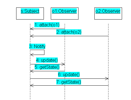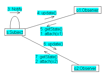 Figura urmatoare reda sablonul de proiectare "Subiect-observator" printr-o diagrama de secventa si prin diagrama de colaborare echivalenta: