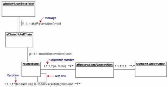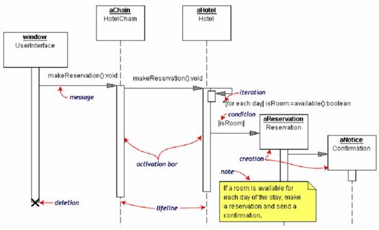 Urmatoarea diagrama reda secventa de operatii pentru rezervarea unei camere de hotel. Obiectul care initiaza secventa de mesaje este o fereastra de rezervare.
