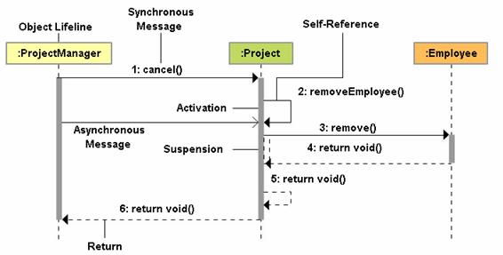 Atunci cand un obiect trimite un mesaj sincron, el ramane in asteptare pana cand destinatarul trateaza mesajul. De aceea, revenirea dupa tratarea unui mesaj sincron nu este necesar sa fie reprezentata.