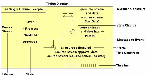 O diagrama de evolutie in timp (Timing diagram) reda derularea in timp a unei activitati cu constrangeri de timp (in care timpul este un element critic). Diagrama cuprinde: o linie de viata, starile in timp, constrangeri de durata, schimbarile de stare, mesaje sau evenimente, linia timpului. Figura reda inregistrarea la un curs intr-o universitate.