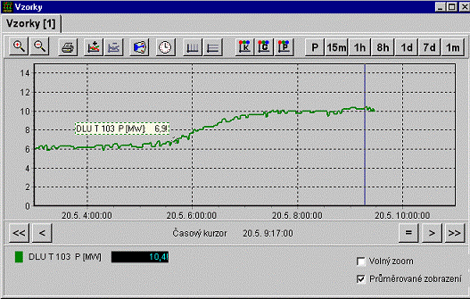 Din grafic se pot citi valorile exacte cu ajutorul cursorului (valorile se ivesc īn fereastra neagra īn partea de jos a figurii - fig. 3 Esantioane) sau prin indicarea mouse-ului pe locul respectiv de pe curba (aici e necesar sa se lase mouse-ul 1 secunda īn liniste) iar lānga cursorul mouse-ului se iveste o fereastra cu denumirea curbei, unitatea si valoarea.
