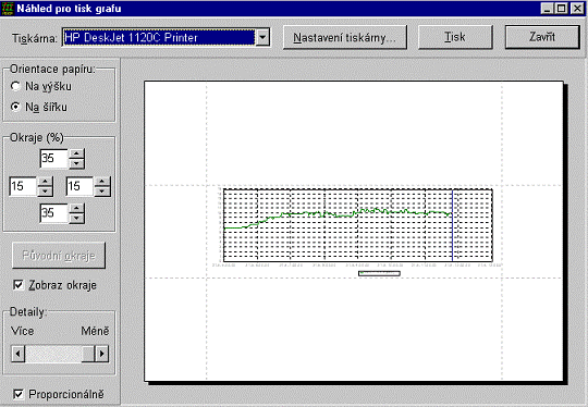 Īn fereastra "Privire pentru imprimarea graficului" se poate alege pozitia hārtiei (pe īnaltime sau pe latime), marimea marginilor īn %, si imprimarea a mai multor sau a mai putine detalii. Imprimarile se efectueaza pe imprimante instalate īn sistemul de operare Windows. Dupa click pe ,,Instalarea imprimantei" se afiseaza dialogul de instalare standard al imprimantei alese īn sistemul de operare dat si īn el se pot instala, īn afara de alti parametrii, si marimea hārtiei si calitatea de imprimare. Dupa finalizarea parametrizarii se valideaza imprimarea prin click pe butonul ,,Imprimare".