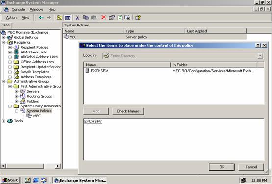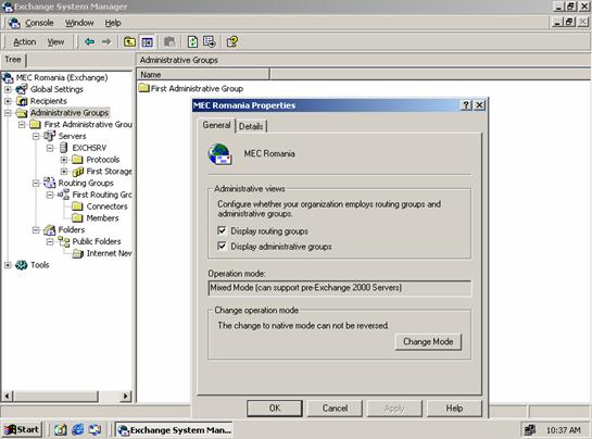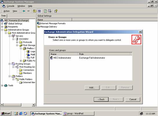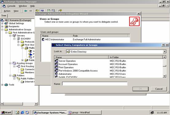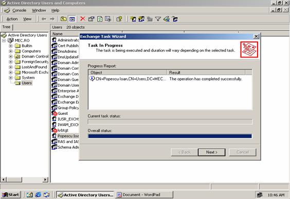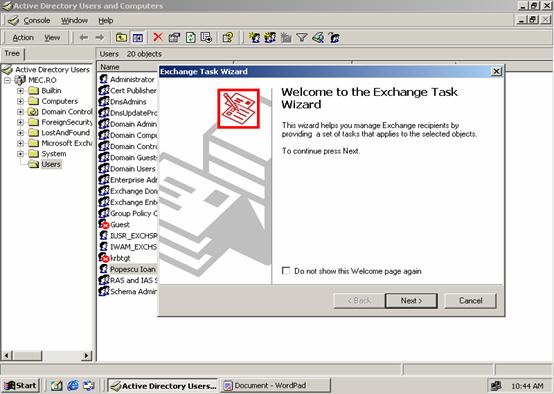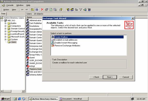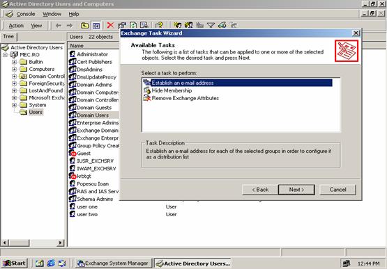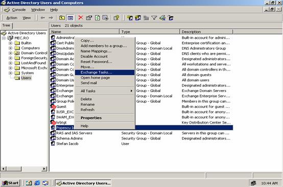 Pentru aceasta deschidem consola MMC 'Active Directory Users and Computers'-click dreapta pe grupul de useri-'Exchange Tasks'-Next-Finish.