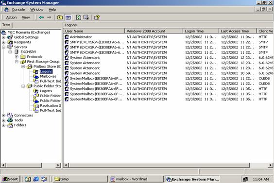 Starea serviciilor de Exchange 2000:'Microsoft Exchange Information Store Service','Microsoft Exchange MTA Stacks','Microsoft Exchange Routing Engine','Microsoft Exchange System Attendant','SMTP','World Wide Web Publishing Service' se poate vizualiza în consola MMC 'Services'.