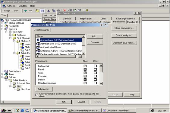 - 'Directory Rights' controlul la nivel de obiecte create pentru aceste containere în Active Directory.