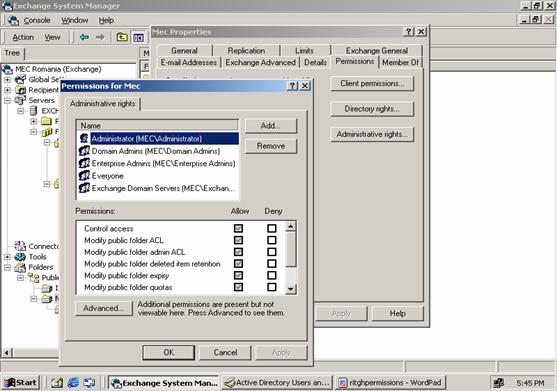 - 'Message Rights' drepturile pentru userii ce pot accesa mesajele trimise email-ul creat pentru aceste containere.