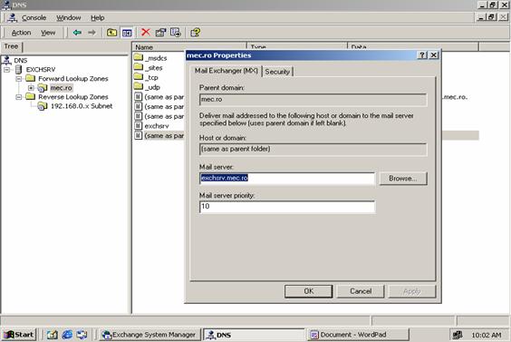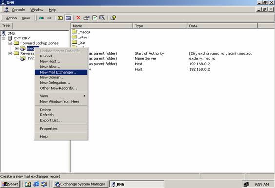 Pentru a creea înregistrarile MX în DNS,cu diferite costuri pentru o toleranta mai mare, se apleleaza consola MMC 'DNS Server' astfel: