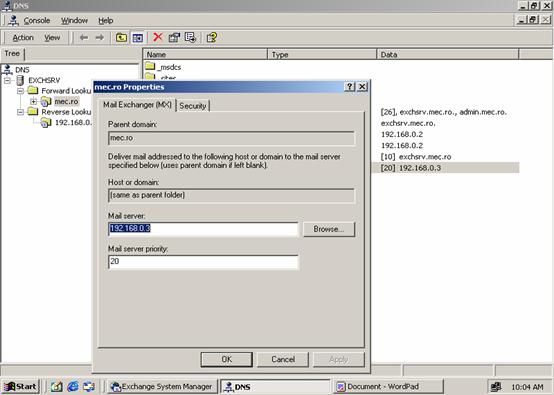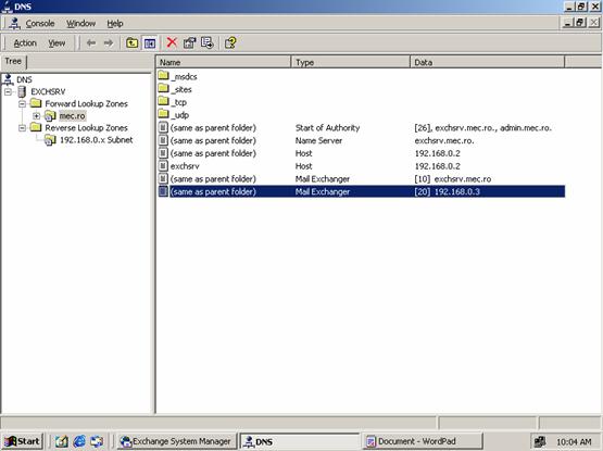 În final cele doua înregistrari trebuie sa apara în consola DNS evidentiindu-se costurile pentru fiecare calculator de Exchange în parte si toleranta la nefunctionarea unuia dintre ele.