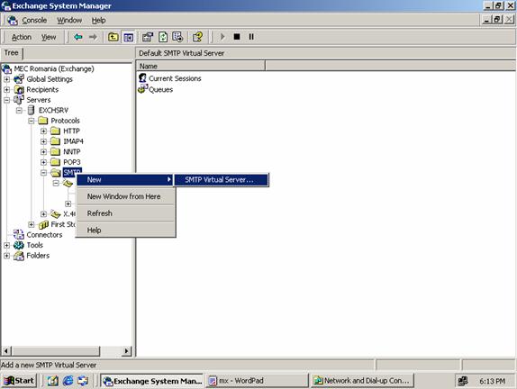 Pentru a creea serverul virtual avem : 'Exchange System Manager'-'Servers'-Name Server-'Protocols'-'SMTP'-New-SMTP Virtual Server-Nume Server.