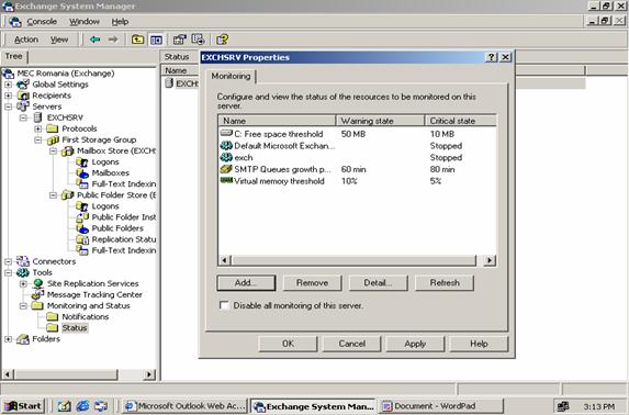 - în fereastra 'Monitoring'-click 'add'-adaugam tipurile de evenimente de monitorizat si anume: oprirea neprevazuta a unor servicii de Exchange,cresterea numarului de mesaje în cozile de asteptare, folosirea memoriei, atingerea limitei spatiului pe disk etc.