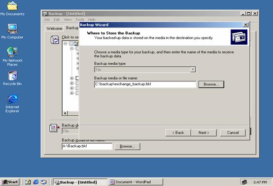 - Alegem 'Back up selected files,drives, or network data' si selectam, alaturi de 'System State' pentru restaurarea configuratiei serverului cu Exchange 2000,si 'Microsoft Information Store' din 'Microsoft Exchange Server' pentru restaurarea mailbox-urilor.
