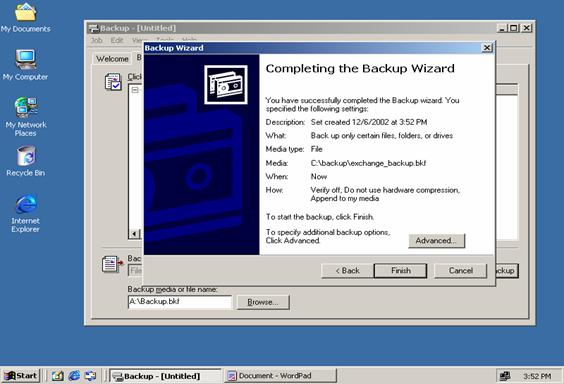 - înainte de final se alege optiunea 'Advanced' unde specificam tipul backup-ului (normal, incremental, diferential), verificarea datelor dupa salvare.