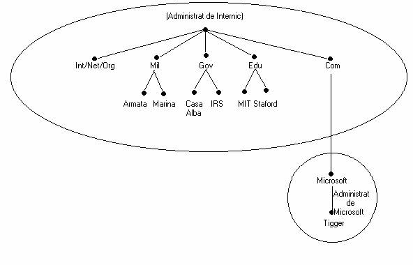 Numele unui domeniu identifica pozitia domeniului în ierarhia logica DNS, în relatie cu domeniul parinte, prin separarea fiecarei ramuri din arborescenta prin punct (.). În figura urmatoare se prezinta câteva dintre domeniile de nivel superior, în care se include si domeniul Microsoft si un host numit Tigger din domeniul microsoft.com. Daca un utilizator doreste sa contacteze acel host, trebuie sa foloseasca numele de domeniu complet calificat tigger.microsoft.com .