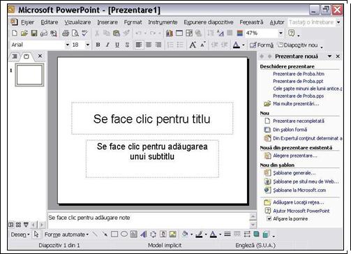 Vizualizarea normala īmparte ecranul īn trei parti majore: taburile schita si diapozitiv, Panoul diapozitive, si Panoul de activitate. Tab-urile schita si diapozitiv sunt localizate īn parte stānga a ecranului. Acestea permit comutarea īntre douǎ moduri de vizualizare. Tab-ul diapozitive arata toate slide-urile. Tab-ul schita arata care este textul. Panoul diapozitive este localizat īn centrul ecranului si prezinta imaginea detaliata a diapozitivului īn lucru. Panoul de activitate este localizat īn partea dreapta a ecranului si permite selectarea activitatii pe care doriti sa o faceti.