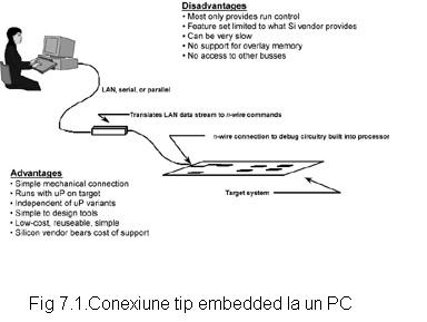 Aceasta varianta de debug a fost dezvoltata de catre firma Motorola.Motorola a fost prima firma care a realizat un procesor cu circuite speciale si functii de debug.In figura de mai jos este reprezentata structura unui sistem de tip embedded cu o conexiune la un PC.Totodata sun prezentate atat avantajele cat si dezavantajele acestui tip de comunicare.