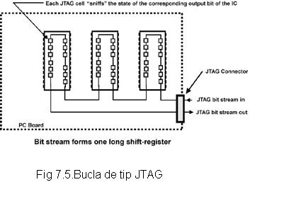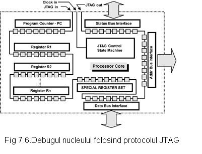 In figura 7.6 avem descrisa o schema simplificata la implementarea debug-ului folosind protocolul JTAG .In cazul in care avem procesorul intern oprit bucla poate fi folosita pentru a face modificari interne in structura procesului.Accesarea memoriei externe a fost foarte inceata pentru ca bus-ul ciclului a fost reconfigurat prin modificari manuale ale valorilor bitilor.