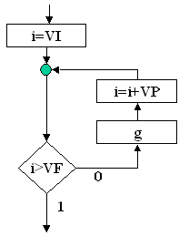 v Structura DO-FOR: este o varianta a structurii WHILE-DO în care predicatul p nu da numai conditia de iesire din ciclu, dar precizeaza si numarul de executii ale corpului ciclului. Acest control se realizeaza cu variabila de control (aici notata cu I) careia I se precizeaza valoarea initiala VI, valoarea finala VF si pasul VP. Variabila de control poate fi utilizata în calculele din prelucrarea g daca prin aceasta nu I se modifica valoarea. Prelucrarea g se mai noteaza în aceasta varianta si prin g(I), pentru a sugera faptul ca executia lui g se face sub controlul variabilei I. Din acelasi motiv se obisnuieste ca predicatul sa se noteze cu p(I). |
