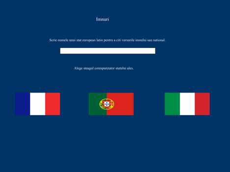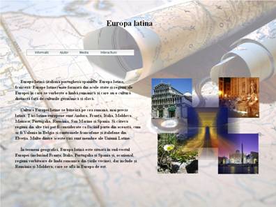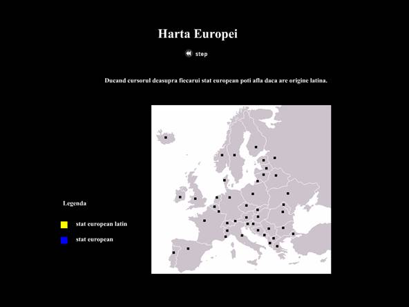 Pagina "harta.html" prezinta o harta a Europei pe care fiecare stat are asociat un patratel negru;prin deplasarea curso-rului deasupra acestuia va aparea numele tarii colorat corespunzator legendei:galben,daca face parte din Europa Latina, albastru in caz contrar.