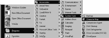 Lansarea în executie se face prin apelarea butonului START PROGRAMS ACCESSORIES CHARACTER MAP (în Windows 98 Character Map se gaseste în SYSTEM TOOLS) fig307