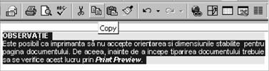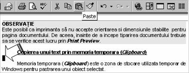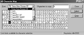 din tabelul Caracter Map se marcheaza simbolul dorit, se apasa butonul Select (care plaseaza caracterul în caseta de text Character to Copy) dupa care se apasa butonul Copy. Depunerea caracterului copiat se face prin apelarea comenzii Paste din meniul Edit sau prin realizarea combinatiei de taste Ctrl+V