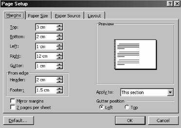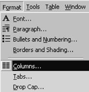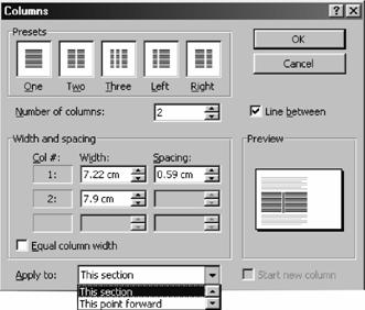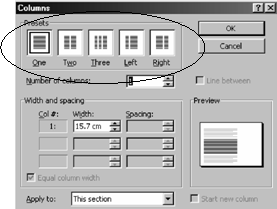 Se selecteaza optiunea Columns din meniul Format fig412 pentru a afisa fereastra de dialog pentru lucrul în coloane.